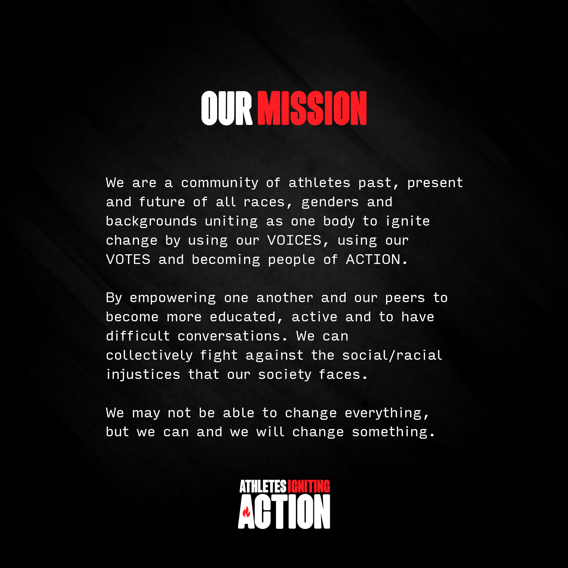 Brand identity framework and positioning for a non profit organization with a mission to empower and encourage athletes from past, present, and future to speak up and take action for the change and justice they believe in. The brand strategy positions AIA as a powerful force, transforming the status quo and igniting for those to fight the social injustices many face today.